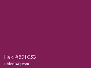 Hex #801c53 Color is a normal magenta color and the nearest color is French Plum #811453. Hex code #801c53 and RGB value is rgb(128,28,83). In RGB color space, this color is composed of 50% red, 11% green, 33% blue, In CMYK color space, this color is composed of 0% cyan, 78% magenta, 35% yellow , 50% black , In HSL color space, this color has a hue angle of 327° , 64% saturation and 31% lightness.