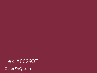Hex #80293e Color is a normal red color and the nearest color is Wine #722f37. Hex code #80293e and RGB value is rgb(128,41,62). In RGB color space, this color is composed of 50% red, 16% green, 24% blue, In CMYK color space, this color is composed of 0% cyan, 68% magenta, 52% yellow , 50% black , In HSL color space, this color has a hue angle of 346° , 51% saturation and 33% lightness.