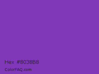 Hex #8038b8 Color is a normal purple color and the nearest color is Studio #714ab2. Hex code #8038b8 and RGB value is rgb(128,56,184). In RGB color space, this color is composed of 50% red, 22% green, 72% blue, In CMYK color space, this color is composed of 30% cyan, 70% magenta, 0% yellow , 28% black , In HSL color space, this color has a hue angle of 274° , 53% saturation and 47% lightness.