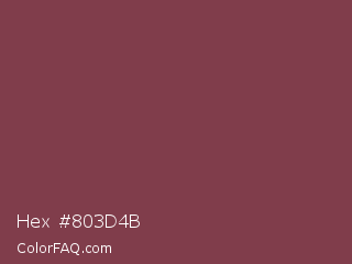 Hex #803d4b Color is a normal red color and the nearest color is Cordovan #893f45. Hex code #803d4b and RGB value is rgb(128,61,75). In RGB color space, this color is composed of 50% red, 24% green, 29% blue, In CMYK color space, this color is composed of 0% cyan, 52% magenta, 41% yellow , 50% black , In HSL color space, this color has a hue angle of 347° , 35% saturation and 37% lightness.