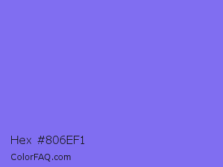 Hex #806ef1 Color is a light indigo color and the nearest color is Medium Slate Blue #7b68ee. Hex code #806ef1 and RGB value is rgb(128,110,241). In RGB color space, this color is composed of 50% red, 43% green, 95% blue, In CMYK color space, this color is composed of 47% cyan, 54% magenta, 0% yellow , 5% black , In HSL color space, this color has a hue angle of 248° , 82% saturation and 69% lightness.