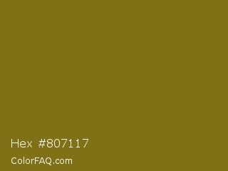 Hex #807117 Color is a dark yellow color and the nearest color is Olivetone #716e10. Hex code #807117 and RGB value is rgb(128,113,23). In RGB color space, this color is composed of 50% red, 44% green, 9% blue, In CMYK color space, this color is composed of 0% cyan, 12% magenta, 82% yellow , 50% black , In HSL color space, this color has a hue angle of 51° , 70% saturation and 30% lightness.