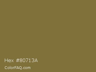 Hex #80713a Color is a normal yellow color and the nearest color is Spanish Bistre #807532. Hex code #80713a and RGB value is rgb(128,113,58). In RGB color space, this color is composed of 50% red, 44% green, 23% blue, In CMYK color space, this color is composed of 0% cyan, 12% magenta, 55% yellow , 50% black , In HSL color space, this color has a hue angle of 47° , 38% saturation and 36% lightness.