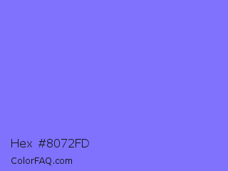Hex #8072fd Color is a light indigo color and the nearest color is Medium Slate Blue #7b68ee. Hex code #8072fd and RGB value is rgb(128,114,253). In RGB color space, this color is composed of 50% red, 45% green, 99% blue, In CMYK color space, this color is composed of 49% cyan, 55% magenta, 0% yellow , 1% black , In HSL color space, this color has a hue angle of 246° , 97% saturation and 72% lightness.