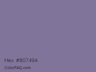 Hex #80749a Color is a normal indigo color and the nearest color is Rhythm #777696. Hex code #80749a and RGB value is rgb(128,116,154). In RGB color space, this color is composed of 50% red, 45% green, 60% blue, In CMYK color space, this color is composed of 17% cyan, 25% magenta, 0% yellow , 40% black , In HSL color space, this color has a hue angle of 259° , 16% saturation and 53% lightness.