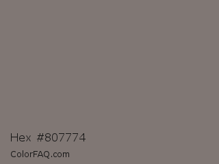 Hex #807774 Color is a normal color and the nearest color is Empress #817377. Hex code #807774 and RGB value is rgb(128,119,116). In RGB color space, this color is composed of 50% red, 47% green, 45% blue, In CMYK color space, this color is composed of 0% cyan, 7% magenta, 9% yellow , 50% black , In HSL color space, this color has a hue angle of 15° , 5% saturation and 48% lightness.