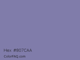 Hex #807caa Color is a normal indigo color and the nearest color is Shadow Blue #778ba5. Hex code #807caa and RGB value is rgb(128,124,170). In RGB color space, this color is composed of 50% red, 49% green, 67% blue, In CMYK color space, this color is composed of 25% cyan, 27% magenta, 0% yellow , 33% black , In HSL color space, this color has a hue angle of 245° , 21% saturation and 58% lightness.