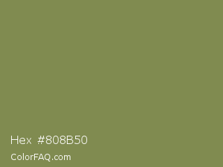 Hex #808b50 Color is a normal lime color and the nearest color is Dark Tan #918151. Hex code #808b50 and RGB value is rgb(128,139,80). In RGB color space, this color is composed of 50% red, 55% green, 31% blue, In CMYK color space, this color is composed of 8% cyan, 0% magenta, 42% yellow , 45% black , In HSL color space, this color has a hue angle of 71° , 27% saturation and 43% lightness.