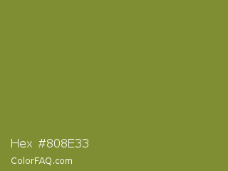 Hex #808e33 Color is a normal yellow color and the nearest color is Wasabi #788a25. Hex code #808e33 and RGB value is rgb(128,142,51). In RGB color space, this color is composed of 50% red, 56% green, 20% blue, In CMYK color space, this color is composed of 10% cyan, 0% magenta, 64% yellow , 44% black , In HSL color space, this color has a hue angle of 69° , 47% saturation and 38% lightness.