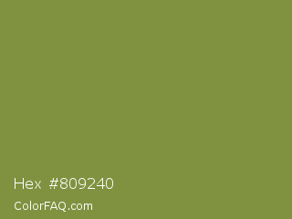 Hex #809240 Color is a normal lime color and the nearest color is Sycamore #908d39. Hex code #809240 and RGB value is rgb(128,146,64). In RGB color space, this color is composed of 50% red, 57% green, 25% blue, In CMYK color space, this color is composed of 12% cyan, 0% magenta, 56% yellow , 43% black , In HSL color space, this color has a hue angle of 73° , 39% saturation and 41% lightness.