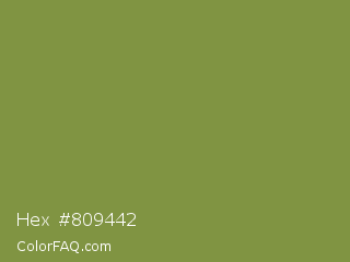Hex #809442 Color is a normal lime color and the nearest color is Palm Leaf #6f9940. Hex code #809442 and RGB value is rgb(128,148,66). In RGB color space, this color is composed of 50% red, 58% green, 26% blue, In CMYK color space, this color is composed of 14% cyan, 0% magenta, 55% yellow , 42% black , In HSL color space, this color has a hue angle of 75° , 38% saturation and 42% lightness.