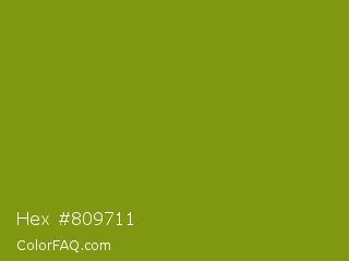 Hex #809711 Color is a normal yellow color and the nearest color is Trendy Green #7c881a. Hex code #809711 and RGB value is rgb(128,151,17). In RGB color space, this color is composed of 50% red, 59% green, 7% blue, In CMYK color space, this color is composed of 15% cyan, 0% magenta, 89% yellow , 41% black , In HSL color space, this color has a hue angle of 70° , 80% saturation and 33% lightness.