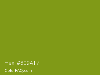 Hex #809a17 Color is a normal lime color and the nearest color is Trendy Green #7c881a. Hex code #809a17 and RGB value is rgb(128,154,23). In RGB color space, this color is composed of 50% red, 60% green, 9% blue, In CMYK color space, this color is composed of 17% cyan, 0% magenta, 85% yellow , 40% black , In HSL color space, this color has a hue angle of 72° , 74% saturation and 35% lightness.
