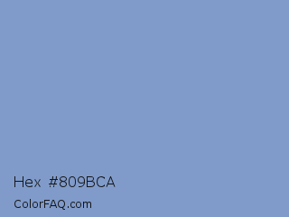 Hex #809bca Color is a light blue color and the nearest color is Dark Pastel Blue #779ecb. Hex code #809bca and RGB value is rgb(128,155,202). In RGB color space, this color is composed of 50% red, 61% green, 79% blue, In CMYK color space, this color is composed of 37% cyan, 23% magenta, 0% yellow , 21% black , In HSL color space, this color has a hue angle of 218° , 41% saturation and 65% lightness.