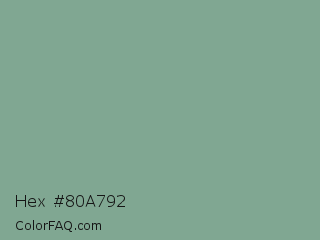 Hex #80a792 Color is a normal green color and the nearest color is Bay Leaf #7da98d. Hex code #80a792 and RGB value is rgb(128,167,146). In RGB color space, this color is composed of 50% red, 65% green, 57% blue, In CMYK color space, this color is composed of 23% cyan, 0% magenta, 13% yellow , 35% black , In HSL color space, this color has a hue angle of 148° , 18% saturation and 58% lightness.
