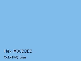 Hex #80bbeb Color is a light blue color and the nearest color is Aero #7cb9e8. Hex code #80bbeb and RGB value is rgb(128,187,235). In RGB color space, this color is composed of 50% red, 73% green, 92% blue, In CMYK color space, this color is composed of 46% cyan, 20% magenta, 0% yellow , 8% black , In HSL color space, this color has a hue angle of 207° , 73% saturation and 71% lightness.
