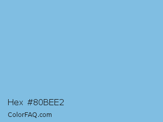 Hex #80bee2 Color is a light blue color and the nearest color is Aero #7cb9e8. Hex code #80bee2 and RGB value is rgb(128,190,226). In RGB color space, this color is composed of 50% red, 75% green, 89% blue, In CMYK color space, this color is composed of 43% cyan, 16% magenta, 0% yellow , 11% black , In HSL color space, this color has a hue angle of 202° , 63% saturation and 69% lightness.