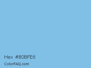 Hex #80bfe6 Color is a light blue color and the nearest color is Aero #7cb9e8. Hex code #80bfe6 and RGB value is rgb(128,191,230). In RGB color space, this color is composed of 50% red, 75% green, 90% blue, In CMYK color space, this color is composed of 44% cyan, 17% magenta, 0% yellow , 10% black , In HSL color space, this color has a hue angle of 203° , 67% saturation and 70% lightness.