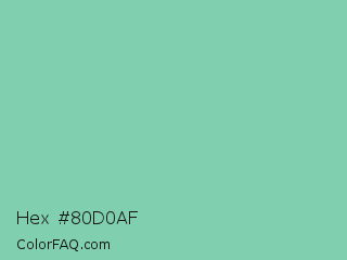 Hex #80d0af Color is a light green color and the nearest color is Vista Blue #8fd6b4. Hex code #80d0af and RGB value is rgb(128,208,175). In RGB color space, this color is composed of 50% red, 82% green, 69% blue, In CMYK color space, this color is composed of 38% cyan, 0% magenta, 16% yellow , 18% black , In HSL color space, this color has a hue angle of 155° , 46% saturation and 66% lightness.