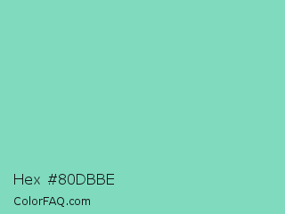 Hex #80dbbe Color is a light green color and the nearest color is Pearl Aqua #88d8c0. Hex code #80dbbe and RGB value is rgb(128,219,190). In RGB color space, this color is composed of 50% red, 86% green, 75% blue, In CMYK color space, this color is composed of 42% cyan, 0% magenta, 13% yellow , 14% black , In HSL color space, this color has a hue angle of 161° , 56% saturation and 68% lightness.