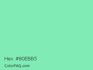 Hex #80ebb5 Color is a light green color and the nearest color is Algae Green #93dfb8. Hex code #80ebb5 and RGB value is rgb(128,235,181). In RGB color space, this color is composed of 50% red, 92% green, 71% blue, In CMYK color space, this color is composed of 46% cyan, 0% magenta, 23% yellow , 8% black , In HSL color space, this color has a hue angle of 150° , 73% saturation and 71% lightness.