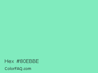 Hex #80ebbe Color is a light green color and the nearest color is Pearl Aqua #88d8c0. Hex code #80ebbe and RGB value is rgb(128,235,190). In RGB color space, this color is composed of 50% red, 92% green, 75% blue, In CMYK color space, this color is composed of 46% cyan, 0% magenta, 19% yellow , 8% black , In HSL color space, this color has a hue angle of 155° , 73% saturation and 71% lightness.