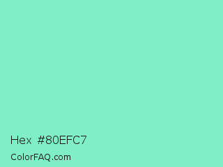 Hex #80efc7 Color is a light green color and the nearest color is Aquamarine #7fffd4. Hex code #80efc7 and RGB value is rgb(128,239,199). In RGB color space, this color is composed of 50% red, 94% green, 78% blue, In CMYK color space, this color is composed of 46% cyan, 0% magenta, 17% yellow , 6% black , In HSL color space, this color has a hue angle of 158° , 78% saturation and 72% lightness.