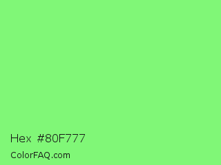 Hex #80f777 Color is a light green color and the nearest color is Pastel Green #77dd77. Hex code #80f777 and RGB value is rgb(128,247,119). In RGB color space, this color is composed of 50% red, 97% green, 47% blue, In CMYK color space, this color is composed of 48% cyan, 0% magenta, 52% yellow , 3% black , In HSL color space, this color has a hue angle of 116° , 89% saturation and 72% lightness.
