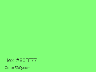 Hex #80ff77 Color is a light green color and the nearest color is Screamin Green #66ff66. Hex code #80ff77 and RGB value is rgb(128,255,119). In RGB color space, this color is composed of 50% red, 100% green, 47% blue, In CMYK color space, this color is composed of 50% cyan, 0% magenta, 53% yellow , 0% black , In HSL color space, this color has a hue angle of 116° , 100% saturation and 73% lightness.