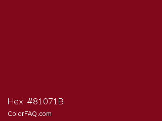 Hex #81071b Color is a dark red color and the nearest color is Burgundy #800020. Hex code #81071b and RGB value is rgb(129,7,27). In RGB color space, this color is composed of 51% red, 3% green, 11% blue, In CMYK color space, this color is composed of 0% cyan, 95% magenta, 79% yellow , 49% black , In HSL color space, this color has a hue angle of 350° , 90% saturation and 27% lightness.