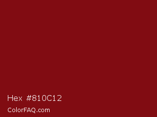 Hex #810c12 Color is a dark red color and the nearest color is UP Maroon #7b1113. Hex code #810c12 and RGB value is rgb(129,12,18). In RGB color space, this color is composed of 51% red, 5% green, 7% blue, In CMYK color space, this color is composed of 0% cyan, 91% magenta, 86% yellow , 49% black , In HSL color space, this color has a hue angle of 357° , 83% saturation and 28% lightness.