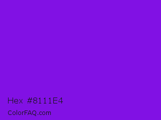 Hex #8111e4 Color is a normal purple color and the nearest color is French Violet #8806ce. Hex code #8111e4 and RGB value is rgb(129,17,228). In RGB color space, this color is composed of 51% red, 7% green, 89% blue, In CMYK color space, this color is composed of 43% cyan, 93% magenta, 0% yellow , 11% black , In HSL color space, this color has a hue angle of 272° , 86% saturation and 48% lightness.