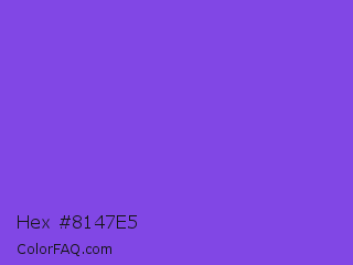 Hex #8147e5 Color is a normal violet color and the nearest color is Navy Purple #9457eb. Hex code #8147e5 and RGB value is rgb(129,71,229). In RGB color space, this color is composed of 51% red, 28% green, 90% blue, In CMYK color space, this color is composed of 44% cyan, 69% magenta, 0% yellow , 10% black , In HSL color space, this color has a hue angle of 262° , 75% saturation and 59% lightness.