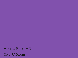 Hex #8151ad Color is a normal purple color and the nearest color is Royal Purple #7851a9. Hex code #8151ad and RGB value is rgb(129,81,173). In RGB color space, this color is composed of 51% red, 32% green, 68% blue, In CMYK color space, this color is composed of 25% cyan, 53% magenta, 0% yellow , 32% black , In HSL color space, this color has a hue angle of 271° , 36% saturation and 50% lightness.