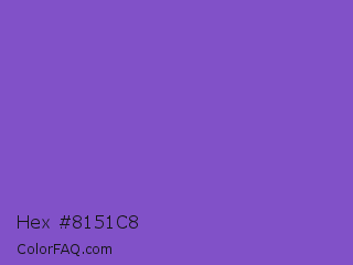Hex #8151c8 Color is a normal violet color and the nearest color is Fuchsia Blue #7a58c1. Hex code #8151c8 and RGB value is rgb(129,81,200). In RGB color space, this color is composed of 51% red, 32% green, 78% blue, In CMYK color space, this color is composed of 36% cyan, 60% magenta, 0% yellow , 22% black , In HSL color space, this color has a hue angle of 264° , 52% saturation and 55% lightness.
