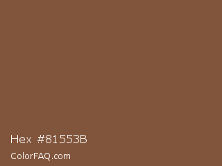 Hex #81553b Color is a normal orange color and the nearest color is Spicy Mix #885342. Hex code #81553b and RGB value is rgb(129,85,59). In RGB color space, this color is composed of 51% red, 33% green, 23% blue, In CMYK color space, this color is composed of 0% cyan, 34% magenta, 54% yellow , 49% black , In HSL color space, this color has a hue angle of 22° , 37% saturation and 37% lightness.