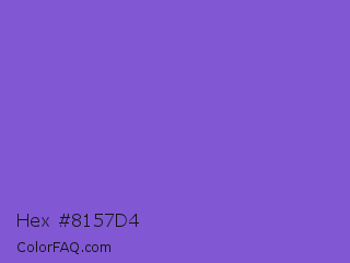 Hex #8157d4 Color is a normal indigo color and the nearest color is Fuchsia Blue #7a58c1. Hex code #8157d4 and RGB value is rgb(129,87,212). In RGB color space, this color is composed of 51% red, 34% green, 83% blue, In CMYK color space, this color is composed of 39% cyan, 59% magenta, 0% yellow , 17% black , In HSL color space, this color has a hue angle of 260° , 59% saturation and 59% lightness.