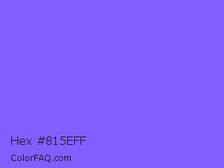 Hex #815eff Color is a light indigo color and the nearest color is Medium Slate Blue #7b68ee. Hex code #815eff and RGB value is rgb(129,94,255). In RGB color space, this color is composed of 51% red, 37% green, 100% blue, In CMYK color space, this color is composed of 49% cyan, 63% magenta, 0% yellow , 0% black , In HSL color space, this color has a hue angle of 253° , 100% saturation and 68% lightness.