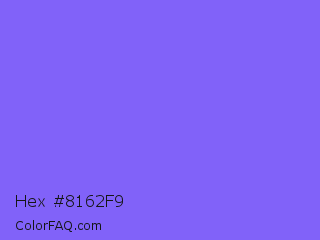 Hex #8162f9 Color is a light indigo color and the nearest color is Medium Slate Blue #7b68ee. Hex code #8162f9 and RGB value is rgb(129,98,249). In RGB color space, this color is composed of 51% red, 38% green, 98% blue, In CMYK color space, this color is composed of 48% cyan, 61% magenta, 0% yellow , 2% black , In HSL color space, this color has a hue angle of 252° , 93% saturation and 68% lightness.