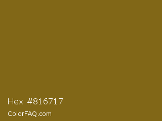 Hex #816717 Color is a dark orange color and the nearest color is Kumera #886221. Hex code #816717 and RGB value is rgb(129,103,23). In RGB color space, this color is composed of 51% red, 40% green, 9% blue, In CMYK color space, this color is composed of 0% cyan, 20% magenta, 82% yellow , 49% black , In HSL color space, this color has a hue angle of 45° , 70% saturation and 30% lightness.