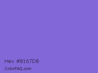 Hex #8167d8 Color is a light indigo color and the nearest color is True V #8a73d6. Hex code #8167d8 and RGB value is rgb(129,103,216). In RGB color space, this color is composed of 51% red, 40% green, 85% blue, In CMYK color space, this color is composed of 40% cyan, 52% magenta, 0% yellow , 15% black , In HSL color space, this color has a hue angle of 254° , 59% saturation and 63% lightness.