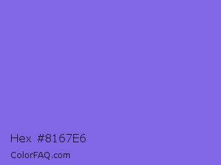 Hex #8167e6 Color is a light indigo color and the nearest color is Medium Slate Blue #7b68ee. Hex code #8167e6 and RGB value is rgb(129,103,230). In RGB color space, this color is composed of 51% red, 40% green, 90% blue, In CMYK color space, this color is composed of 44% cyan, 55% magenta, 0% yellow , 10% black , In HSL color space, this color has a hue angle of 252° , 72% saturation and 65% lightness.