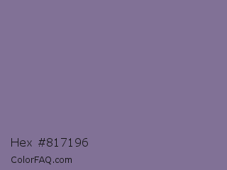 Hex #817196 Color is a normal violet color and the nearest color is Rhythm #777696. Hex code #817196 and RGB value is rgb(129,113,150). In RGB color space, this color is composed of 51% red, 44% green, 59% blue, In CMYK color space, this color is composed of 14% cyan, 25% magenta, 0% yellow , 41% black , In HSL color space, this color has a hue angle of 266° , 15% saturation and 52% lightness.