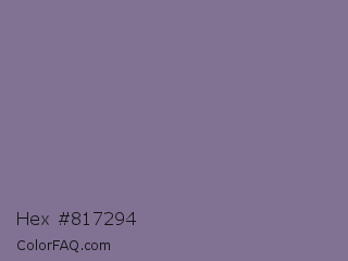 Hex #817294 Color is a normal violet color and the nearest color is Rhythm #777696. Hex code #817294 and RGB value is rgb(129,114,148). In RGB color space, this color is composed of 51% red, 45% green, 58% blue, In CMYK color space, this color is composed of 13% cyan, 23% magenta, 0% yellow , 42% black , In HSL color space, this color has a hue angle of 266° , 14% saturation and 51% lightness.