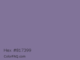 Hex #817399 Color is a normal violet color and the nearest color is Rhythm #777696. Hex code #817399 and RGB value is rgb(129,115,153). In RGB color space, this color is composed of 51% red, 45% green, 60% blue, In CMYK color space, this color is composed of 16% cyan, 25% magenta, 0% yellow , 40% black , In HSL color space, this color has a hue angle of 262° , 16% saturation and 53% lightness.