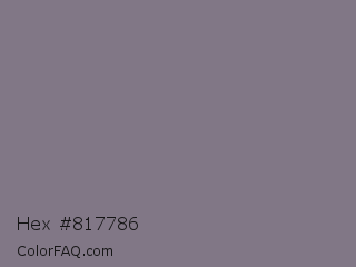 Hex #817786 Color is a normal purple color and the nearest color is Mobster #7f7589. Hex code #817786 and RGB value is rgb(129,119,134). In RGB color space, this color is composed of 51% red, 47% green, 53% blue, In CMYK color space, this color is composed of 4% cyan, 11% magenta, 0% yellow , 47% black , In HSL color space, this color has a hue angle of 280° , 6% saturation and 50% lightness.