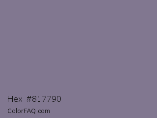 Hex #817790 Color is a normal violet color and the nearest color is Mobster #7f7589. Hex code #817790 and RGB value is rgb(129,119,144). In RGB color space, this color is composed of 51% red, 47% green, 56% blue, In CMYK color space, this color is composed of 10% cyan, 17% magenta, 0% yellow , 44% black , In HSL color space, this color has a hue angle of 264° , 10% saturation and 52% lightness.