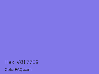 Hex #8177e9 Color is a light indigo color and the nearest color is Medium Slate Blue #7b68ee. Hex code #8177e9 and RGB value is rgb(129,119,233). In RGB color space, this color is composed of 51% red, 47% green, 91% blue, In CMYK color space, this color is composed of 45% cyan, 49% magenta, 0% yellow , 9% black , In HSL color space, this color has a hue angle of 245° , 72% saturation and 69% lightness.