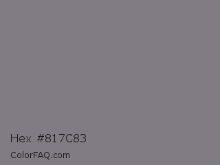 Hex #817c83 Color is a normal purple color and the nearest color is Gray #808080. Hex code #817c83 and RGB value is rgb(129,124,131). In RGB color space, this color is composed of 51% red, 49% green, 51% blue, In CMYK color space, this color is composed of 2% cyan, 5% magenta, 0% yellow , 49% black , In HSL color space, this color has a hue angle of 283° , 3% saturation and 50% lightness.