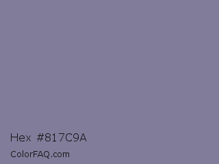 Hex #817c9a Color is a normal indigo color and the nearest color is Waterloo #7b7c94. Hex code #817c9a and RGB value is rgb(129,124,154). In RGB color space, this color is composed of 51% red, 49% green, 60% blue, In CMYK color space, this color is composed of 16% cyan, 19% magenta, 0% yellow , 40% black , In HSL color space, this color has a hue angle of 250° , 13% saturation and 55% lightness.